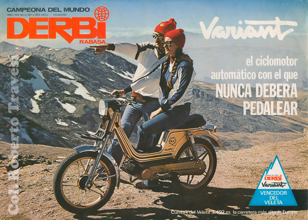 Como curiosidad de cara a este hilo y para animaros a participar y dar vuestras opiniones y experiencias, traemos a continuación una singular imagen de uno de los accesos a la Sierra. Se trata de la primera Derbi Variant oficial que coronó el Veleta, concretamente el modelo de los años 1969 y 1970 en 50 c.c. (hubo también de 125 c.c. en 1971 y 1972). Se trata de una publicidad de 1979 (anverso para la foto superior y una parte del reverso en la imagen inferior), en el que se indicaba que era un "ciclomotor automático con el que nunca deberá pedalear"... habría que ver como llegarían de hirviendo los motores, es mucha cuesta, altitud y falta de oxígeno por ello. ¡Que tiempos aquellos!, en donde la marca te daba un año de garantía y donde no era necesario ni examen de conducir (solo licencia), además de no requerirse matrícula ni seguro obligatorio (amén de estar exenta de impuestos).