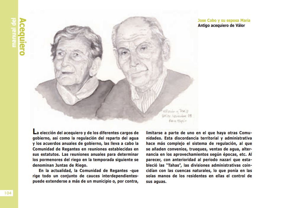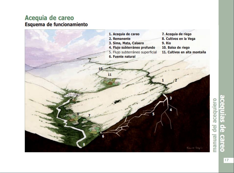 En la cápsula 2.5 se aborda el agua desde el punto de vista de su uso ("domesticación") por el habitante de Sierra Nevada. Sin duda un importante y muy interesante elemento para diversos ambientes de la Sierra de gran valor ecológico, cultural o patrimonial por ejemplo. Porque las acequias modelan una parte del paisaje de la Sierra, aportando numerosos beneficios ecosistémicos. Para quien desee conocer más acerca de este tema, os adjuntamos un enlace (*) donde podréis encontrar un muy interesante y didáctico libro con bellas ilustraciones publicado por la Junta de Andalucía (Manual del acequiero, 2010 ). Se trata de un libro que forma parte del Programa de Recuperación y Conservación de Acequias Tradicionales en el Espacio Natural de Sierra Nevada. Os animamos pues a su lectura y, si es posible, adquirirlo físicamente. A continuación, algunas imágenes de esta publicación.