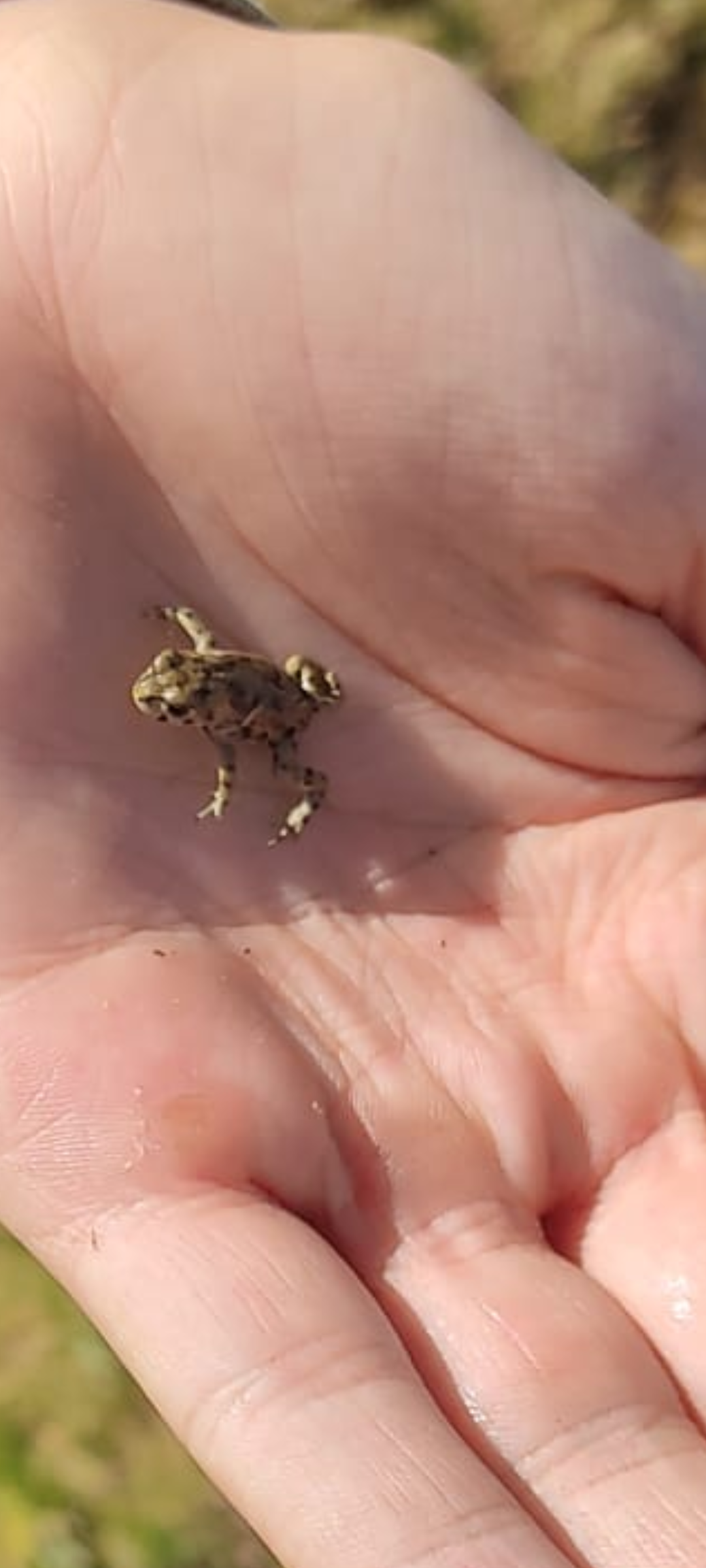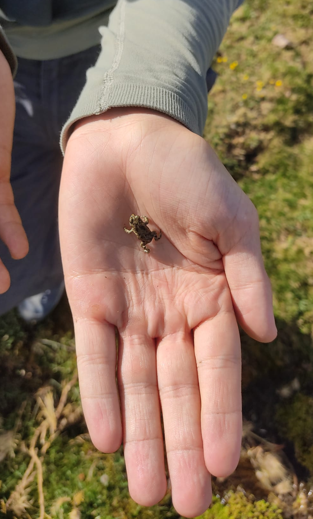 "Una foto del espécimen junto a mi mano, que para se haga una idea mi mano mide unos 18 centímetros, el animal mide unos 1'5 centímetros. La rana se encontraba junto a numerosos renacuajos y había varias ranas de su mismo tamaño y algunas incluso más chicas; se encontraban en un borreguil en un cauce de agua. Se trata de la vertiente norte de la sierra en unas cotas de entre 2300 y 2400 metros".