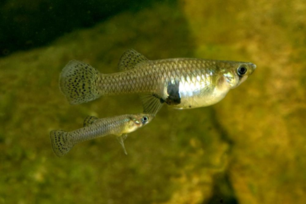 Imagen 4. Macho y hembra de Gambusia holbrooki.Gunther Schmida / http://www.guntherschmida.com.au. License: CC BY Attribution-Noncommercial-ShareAlike 3.0[1] y reproducción del botijo utilizado para la “siembra” de gambusias.