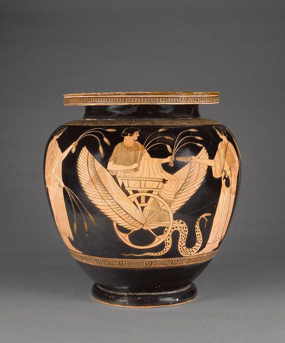 Tras el dictamen de Zeus, se restableció el ciclo natural interrumpido por el duelo de Deméter, los campos volvieron a dar frutos y las Dos Diosas encargaron a Triptólemo (o Demofonte) que enseñara a los hombres el cultivo del trigo, misión que cumplió montado en un carro tirado por serpientes (figs. 28-29).