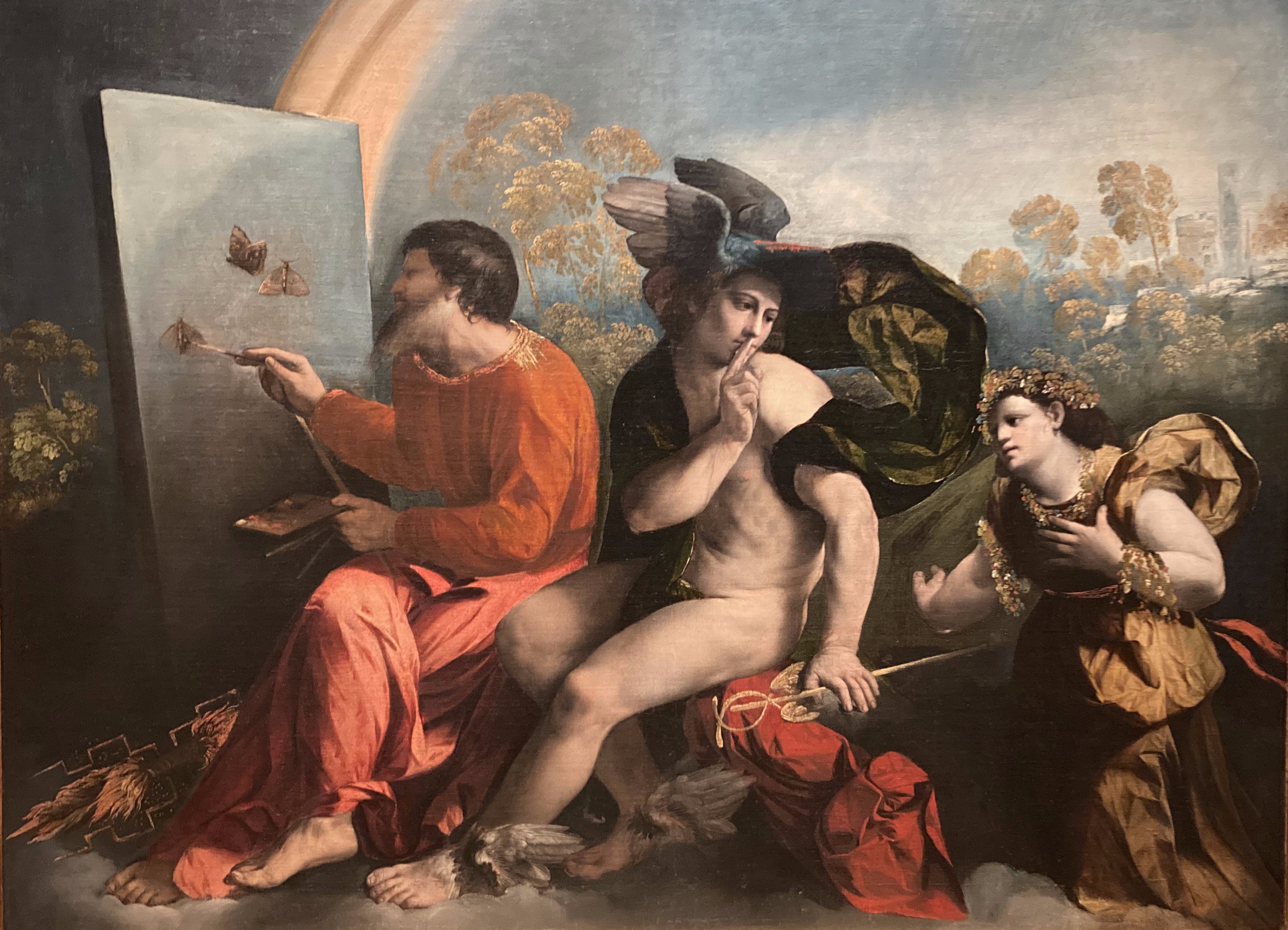 La identificación neoplatónica de Psique con el alma que bajo el impulso de Eros aspira a la inmortalidad, adopta una novedosa plasmación místico-hermética en este lienzo de Dosso Dossi: Mercurio ordena a la Virtud que guarde silencio, para no interrumpir a Júpiter que, dejando en el suelo los rayos y truenos, ha empuñado paleta y pinceles para pintar mariposas, es decir, almas. Presumiblemente, pues, en esta alegoría mitológica subyace la reivindicación tanto del propio pintor como de su arte (fig. 8).