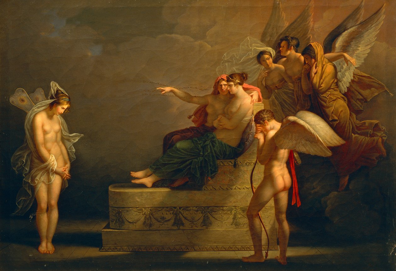 Angelica Kauffmann dedicó un ciclo pictórico al relato de Apuleyo. A él pertenece el siguiente cuadro, donde Venus, celosa de la belleza de Psique, le ordena cumplir las pruebas, sumiendo a Cupido en la desolación.