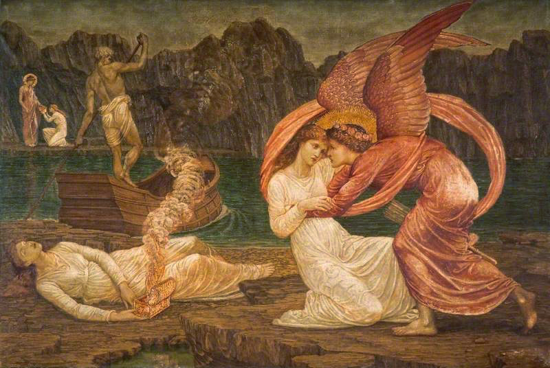 Edward Burne-Jones, por su parte, trató el tema en numerosas ocasiones, inspirándose en la versión ofrecida por su amigo Willian Morris en el poema dedicado al mes de mayo de El Paraíso terrenal (The Earthly Paradise, 1868-1870). En los distintos planos de la siguiente imagen se ilustra la secuencia de Psique en los Infiernos recibiendo de Prosérpina el elixir de la Juventud, el sueño en que se sume al abrir el cofre y el momento en que la revive Cupido (Fig. 20).