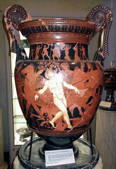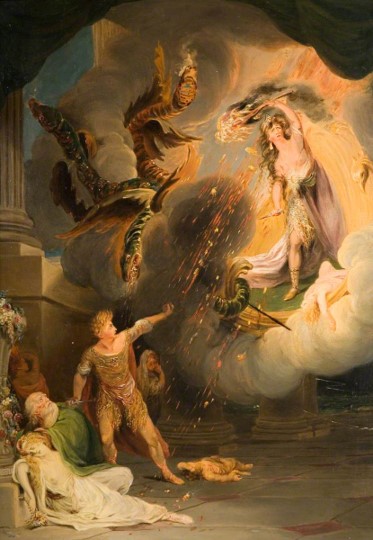 Mientras estas cosas sucedían en Yolco, Jasón se ha prometido con Glauce, hija del rey de Corinto, de modo que, cuando vuelve Medea, es condenada al exilio, pero consigue quedarse un día más y llega a la ciudad Egeo, que promete llevarla consigo a Atenas si sanaba su esterilidad. Entonces Medea lleva a cabo su célebre e hiperbólica venganza: primero, hace llegar a Glauce unos regalos encantados que, nada más colocárselos, la matan, como también a su padre Creonte cuando intenta socorrerla. Después, degüella a los hijos que había tenido con Jasón y se marcha de Corinto en un carro tirado por serpientes que le envía su abuelo el dios Helio (fig. 88-89-90-91). Jasón queda, por tanto, privado de esposa e hijos, es decir, de cuanto hace a un hombre ciudadano. No obstante, volvió a Yolco y celebró unos juegos fúnebres en honor de Pelias en los que participaron los principales Argonautas, incluida Atalanta, que venció en la lucha a Peleo, padre de Aquiles (Módulo 6).