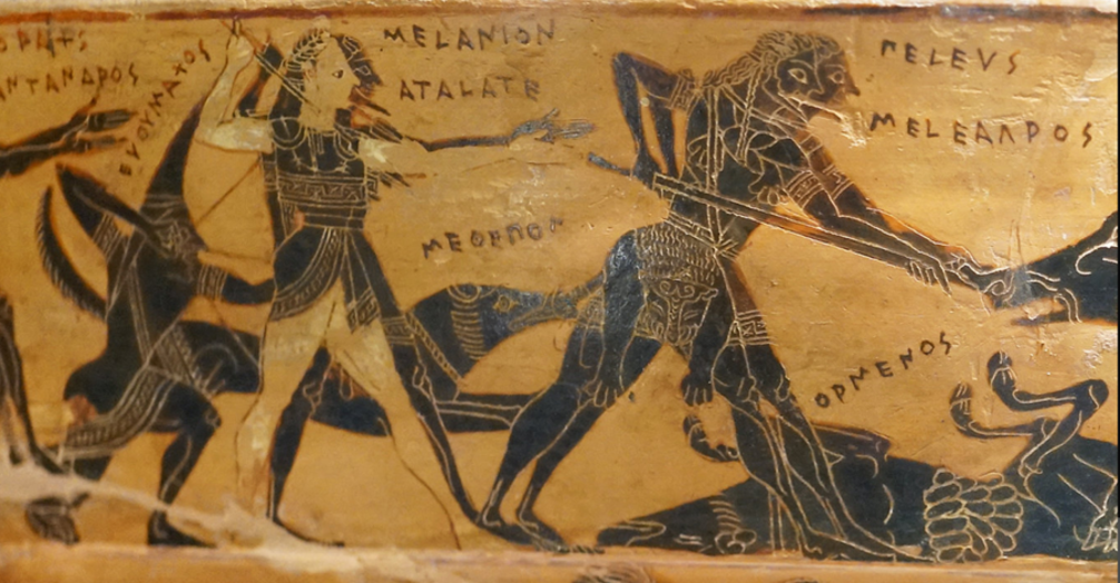 Hijo de Eneo (o Ares) y de Altea, hermano de Deyanira, esposa de Heracles (Unidad 4.2), Meleagro participa en una empresa colectiva: la cacería del monstruoso jabalí de Calidón, enviado por Ártemis como castigo por no haber sido honrada debidamente. Participan en la cacería los más importantes héroes del momento, incluyendo a Atalanta (cf. supra §1 y fig. 37-38-39-40-41), y entre todos acosan y derriban al monstruo, pero es Meleagro quien le da el golpe final, de modo que reclama la piel como trofeo y se la regala a Atalanta, provocando la indignación de sus tíos maternos. El héroe se enfrenta con ellos y los mata. Cuando su madre Altea se entera de ello, arroja al fuego un tizón que, según le habían predicho las Moiras al nacer Meleagro, contenía la esencia vital del hijo, de modo que, si lo quemaba por completo, Meleagro moriría, tema del “alma externada” frecuente en los cuentos populares. Sea como sea, cuando Altea comprende lo que ha hecho llevada por la ira se suicida.