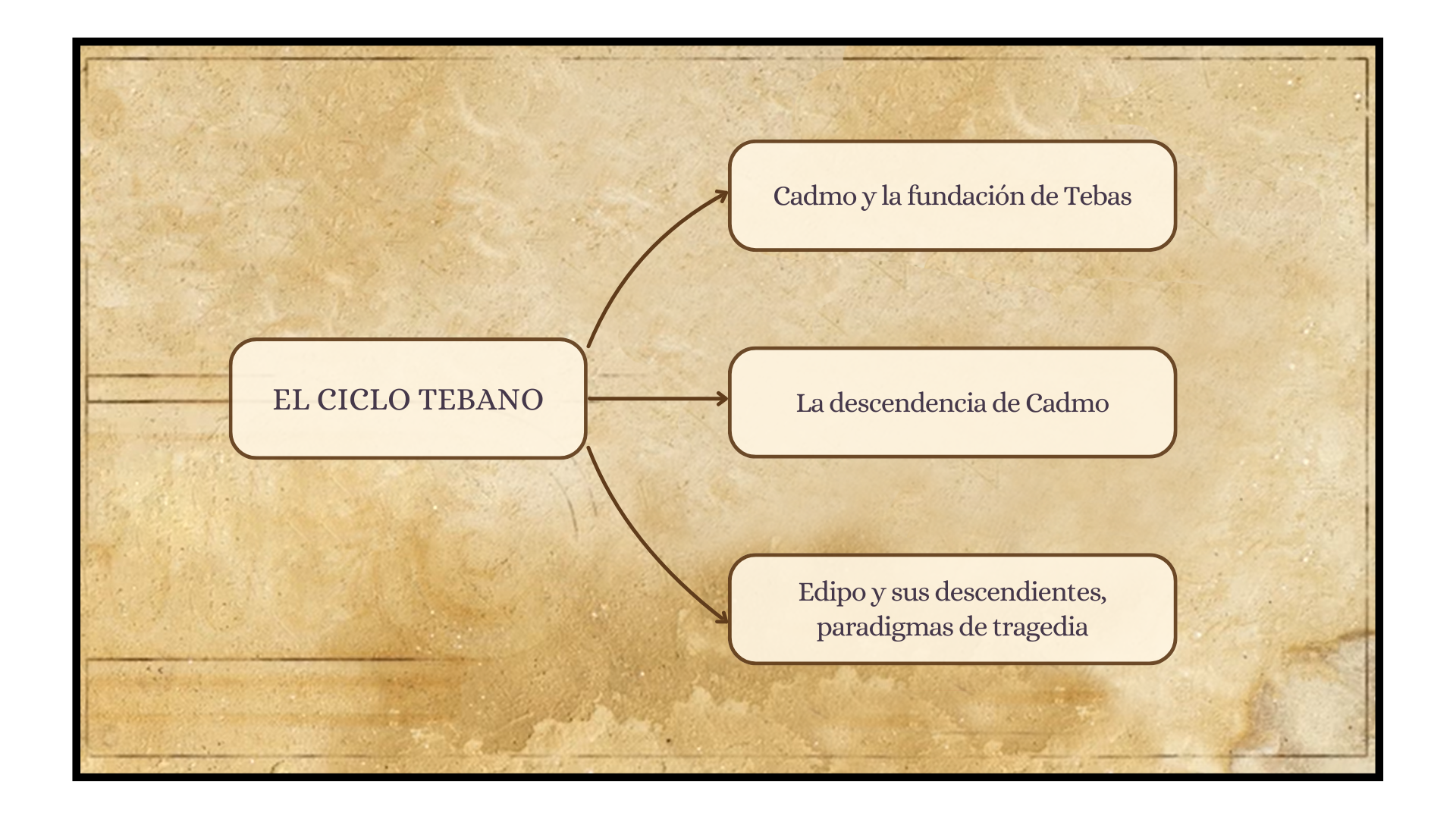 El ciclo tebano es muy amplio, dado que abarca desde la fundación de Tebas a las hazañas de Hércules (Módulo 5) o las guerras posteriores a la muerte de Edipo (cf. infra §3 ). En esta unidad se verán las fases iniciales y los principales mitos.