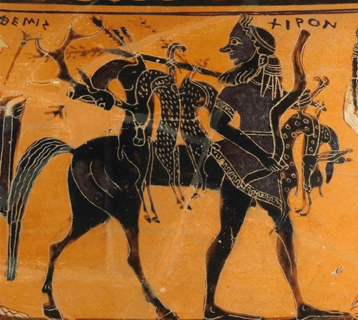 Jasón era hijo de Esón, rey de Yolco, en la región de Tesalia, pero reinaba su tío Pelias hasta que él alcanzara la mayoría de edad. El niño fue educado, como otros héroes, por el centauro Quirón (fig. 64) y, cuando creció, se presentó en Yolco para reclamar el trono, pero su atuendo era algo extraño, aunque propio de alguien criado con un Centauro: parecía un salvaje vestido con pieles, portando una lanza y descalzo, pues había perdido una sandalia en el camino (fig. 65). Cuando Pelias lo vio, recordó cierto oráculo que le había predicho que sería destronado por uno con el pie descalzo, de modo que impuso a Jasón que, para demostrar su origen regio, le trajera el vellón de oro que se custodiaba en la Cólquide. Todo formaba parte de un plan de Hera para traer a Medea a la Hélade y castigar así a Pelias, pues no la había honrado en los sacrificios. La diosa, pues, cumple desde el principio la función de ayudante del héroe y, de hecho, cuando Jasón se dirigía hacia Yolco, se topó con una anciana que le pidió que le ayudara a cruzar un río y, al hacerlo, Jasón perdió la sandalia. La vieja era la diosa disfrazada e hizo que se iniciara el pronóstico del oráculo.