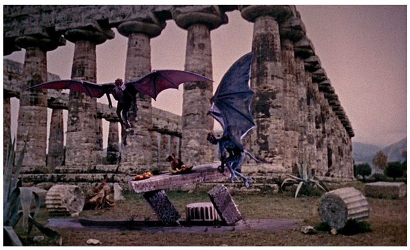 La siguiente escala fue la costa de Misia y enviaron a Hilas a por agua. Una Ninfa se enamoró de él y, cuando se agachó para sacar el agua de la fuente, la Ninfa lo atrapó y lo introdujo en el agua ahogándolo (fig. 69). Heracles, que viajaba con ellos, y Polifemo, partieron en busca de Hilas, pero no lo encontraron. Los Argonautas los abandonaron y continuaron el viaje, llegando al país de los Bébrices, cuyo rey, Ámico, era un gigante incivilizado hijo de Poseidón que retaba a un combate de pugilato a todos los extranjeros que llegaban a su tierra y, como los vencía, colgaba sus cabezas en la entrada del palacio. Se enfrentó a él Pólux, hijo de Zeus y de Leda (Módulo 3), venciéndolo con su notable técnica pugilística, por lo que se produjo una batalla entre Bébrices y Argonautas. Una vez que vencieron, continuaron el viaje y una tempestad los arrojó hasta la costa del Helesponto, donde vivía Fineo, ciego y maldito por los dioses por haber revelado sus secretos. Así, Zeus lo castigó a que las Harpías, ogresas con cuerpo híbrido mujer-pájaro, hijas de Taumante y Electra (Módulo 2), le arrebataran los alimentos y, lo que no se podían llevar, lo pudrían con sus excrementos (fig. 70-71). Los Argonautas pactaron con Fineo que, si lo liberaban de las Harpías, les revelaría los pormenores de su viaje, de modo que Zetes y Cálais, jóvenes alados hijos del dios del viento Bóreas, persiguieron a las Harpías para matarlas (fig. 72-73), pero la diosa Iris aparece en el último momento y evita su muerte, pues cumplían designios de Zeus. Fineo, liberado de las Harpías, cuenta a los Argonautas los peligros que les esperan y cómo evadirlos, en concreto cómo sobrepasar las “Rocas Simplégades” (unos escollos que se cerraban cuando pasaban entre ellos los barcos) utilizando una paloma que hizo cerrarse el escollo y, mientras se volvía a abrir, cruzó la Argo rápidamente.