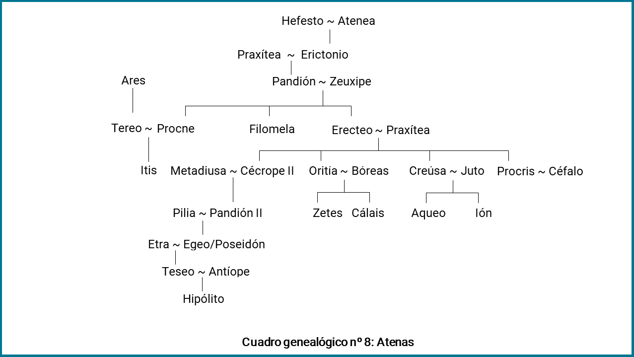 Según la tradición, quizás, más antigua, Teseo era hijo de Egeo, rey de Atenas y descendiente de Erictonio, el autóctono nacido del semen de Hefesto (Unidad 2.2); las fuentes concuerdan en el nombre de su madre, Etra, hija de Piteo, rey de Trecén, en el Peloponeso, y nieta de Pélope. Según esto, pues, por parte de ambos progenitores descendía de Zeus (cuadros genealógicos 8 y 9).
