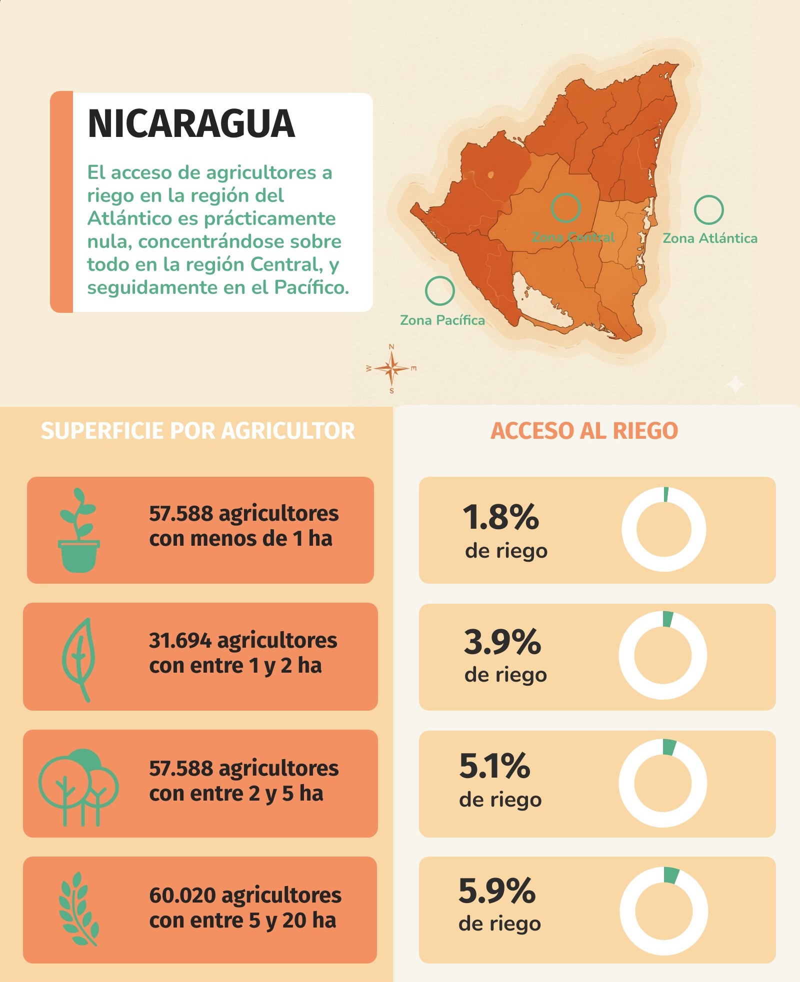 En Nicaragua se debe destacar el escaso acceso de los pequeños agricultores al riego. Del conjunto de agricultores con menos de 1 ha (aproximadamente 57.588), únicamente el 1.8% tiene acceso al riego. Del grupo de agricultores con una superficie entre 1 y 2 ha (31.694), solo el 3.90% tiene acceso al riego. De igual manera para las categorías de 2-5 ha (49.528 productores, 5.10% de acceso), 5-20 ha (60.020 productores, 5.9% de acceso). El acceso de agricultores al riego en la región del Atlántico es prácticamente nulo, concentrándose sobre todo en la región Central, y seguidamente en el Pacífico (Zegarra y Chirinos, 2016).