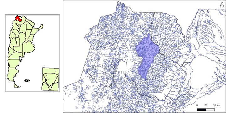 En la Argentina se destaca el regadío tradicional de la Quebrada de Humahuaca, un valle árido que se encuentra en la porción central de la provincia de Jujuy (extremo noroeste de la Argentina). Es una región conformada por un conjunto de quebradas subsidiarias del río Grande, su colector principal, y su poblamiento ronda los 11.000 años de antigüedad, que fue declarada en el año 2003 por la UNESCO como “Patrimonio Cultural y Natural de la Humanidad” (Bergesio y Montial, 2010). La región se caracteriza por la escasez de precipitación pluvial y grandes pérdidas por evapotranspiración proporcional a la temperatura. Se trata de un clima de desiertos tropicales, con pocas lluvias (menores a 180 mm anuales) concentradas en verano, temperaturas medias anuales inferiores a 18 °C, de inviernos muy fríos (Buitrago, 2002). Esta cuenca tiene un marcado carácter torrencial y un desarrollo altitudinal muy importante, que varía entre los 5.856 m.s.n.m. en las nacientes de uno de sus tributarios, el río Grande, a cerca de 1.622 m.s.n.m. en su punto de cierre, sobre la localidad de León. Se estima que en la Quebrada se destinan 2.000 ha a la producción intensiva con riego, en especial de hortalizas (Ministerio de Producción de Jujuy, 2011). De acuerdo con la Dirección Provincial de Recursos Hídricos (DPRH, 2007), en la Quebrada existen cerca de 165 km de canales, prácticamente sin revestir en su totalidad.