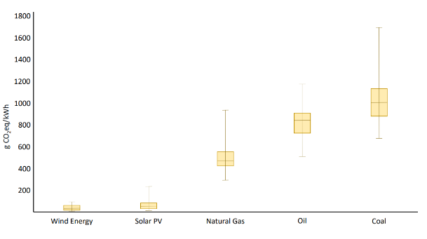 Figura 1. Emisiones de gases de efecto invernadero de diferentes tecnologías de generación de electricidad -en g CO2eq/kWh