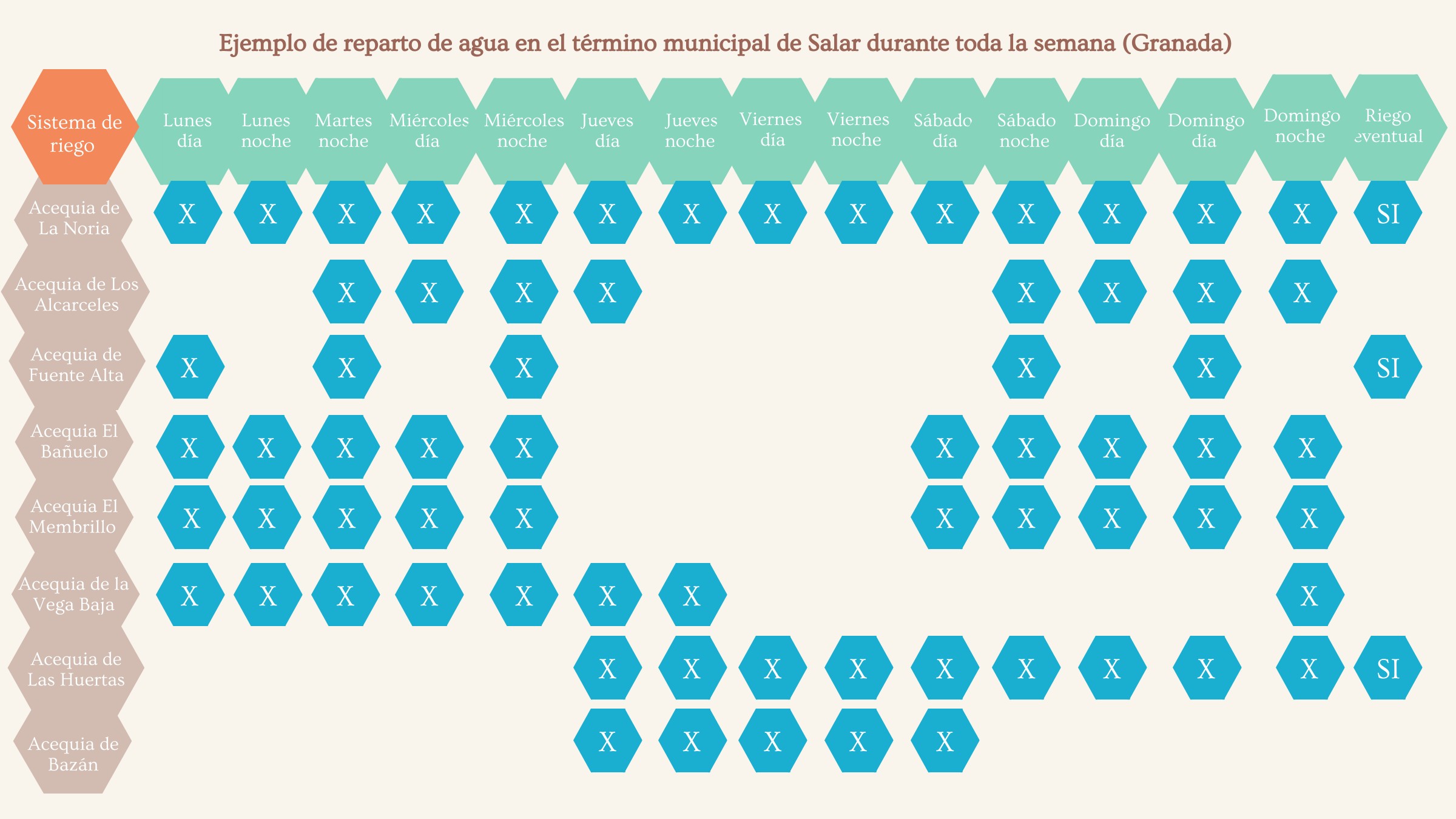 Poniendo algún ejemplo, hay CCRR que reparten el agua según los días de la semana, incluso existen la acequia del jueves, la acequia del viernes (ejemplo del municipio de Cáñar, en la Alpujarra granadina). Es por ello también la importancia de la toponimia para entender el funcionamiento de estos complejos sistemas y en ocasiones el nombre de la acequia, de la huerta, del pago o de alguna zona va a llevar implícito esta forma de reparto. En otros casos, dentro del día que corresponde el riego, hay un reparto concreto a cada parcela: de tres a cinco, cinco a siete, de siete a ocho… (ejemplo de la acequia Gorda en Granada)